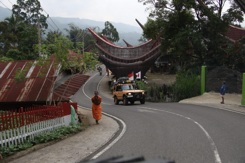 トラジャ族の舟形屋根家屋トンコナンが立ち並ぶタナ・トラジャ市郊外を走るディスカバリー。最高峰のアラビカコーヒーを生産するトラジャは、独特な文化を持つ秘境。