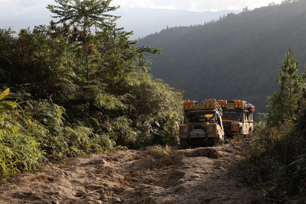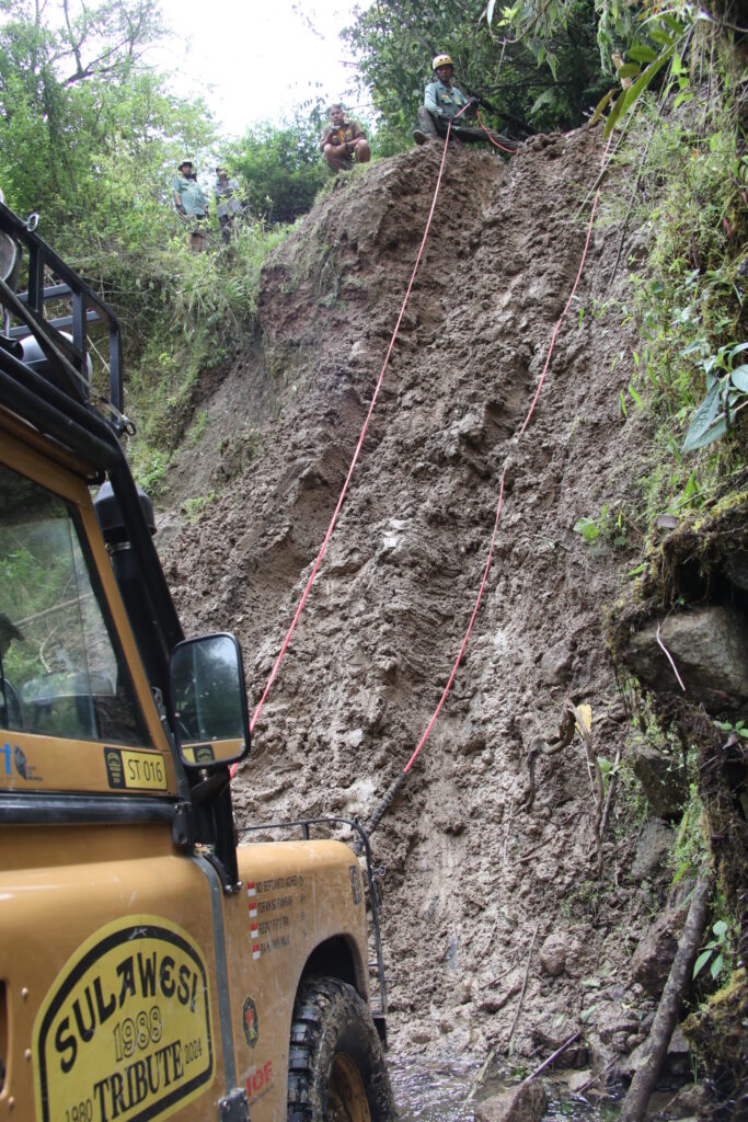 シングルバーナーの乾いた燃焼音で目を覚ますと、メンバー達はすでに朝食の準備を始めていた。まだ6時前、寒くて目が覚めてしまったようだ。朝食後、先行グループに動く気配が無いため徒歩で偵察に向かうと、遠方からタイヤが泥岩を蹴る音とウインチの唸る音が聞こえてきた。雨で泥濘む坂道を注意深く下ると、高低差10mほどの谷で、ほぼ垂直の崖をウインチで登るランドローバーが見えてきた。崖を登るとそこは山肌になっており、ルートは左に抜けている。そのためウインチアンカーは複数取られ、登り切ったところにはスナッチブロックが3つ複雑なラインワークによって固定されていた。このようなウインチングセクションにアタックするため、ツインモーターなどの強力ウインチを装着している車が多いが、フル装備のランドローバーは思いのほか重く、ダブルラインにトラクションを加えてもスムーズに上る車両はいない。逆に消費電力の過多などで電装系トラブルが多発。数台のランドローバーは宙づり状態のまま修理を余儀なくされ、その間はコンボイの動きも完全停滞してしまう。