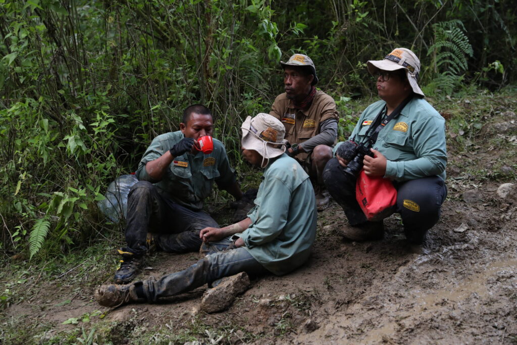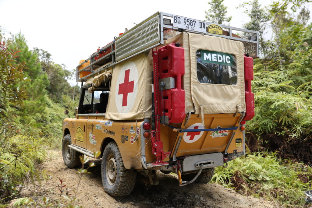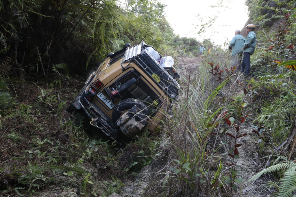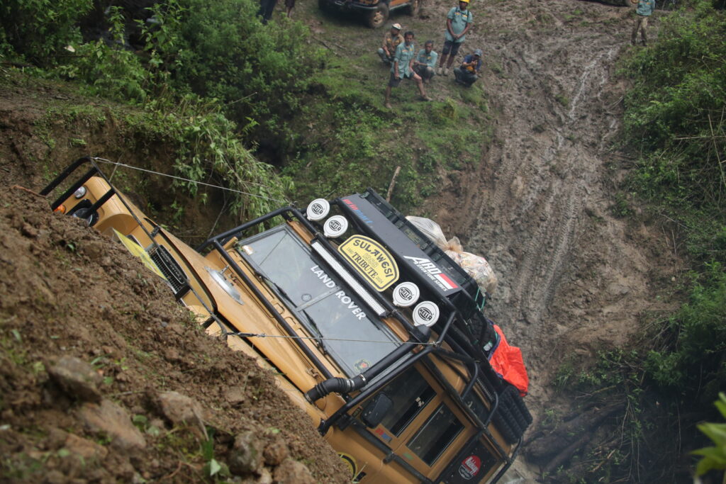 ホテルでのスタートセレモニーを終え、一団はトレイルのスタート地点であるバルップル村に到着。村はずれの農道の分岐を曲がると、雨に洗掘された立て溝が無数にあるヒルクライムが始まり、先導の我々チームからトレイルに踏み入った。ところがのっけから深いV字溝の洗礼を受け、ウインチなどをつかって少しずつ前進する事となり、車両に過大な負荷が掛かり続けた。その結果、700mほど進んだ地点でディスカバリーのリアデフギアが粉砕し、加えてチームリーダーのウインチにも問題が生じたため先導を後続チームに譲ることになった。ウインチはメカニカルなトラブルだったため、何とか動かせるレベルまで復旧。ディスカバリーはチームメンバーが山を下り、街で中古のデフギアを見つけて既に修理が始まっている。夕方には雨が降り始めて気温が下がり、修理を終えた我々の体温を奪っていく。赤道近くの南国で育ったインドネシアのメンバー達に取っては、思いもよらぬ寒さだったようだ。コンボイの最後尾チームになった我々は、先行チームに追いついた所で日没を迎えてキャンプする事になった。安全の面から、日没後はレスキューを伴う作業はしないよう規則が定められているからだ。たしかに夜間のレスキューは、思いもよらぬ事故が発生しがちなため、とても効果的な規則といえる。テントに落ちる雨音は、疲労した身体にはただの子守歌、寒さなど感じることも無く瞬く間に深い眠りにつくことができた。