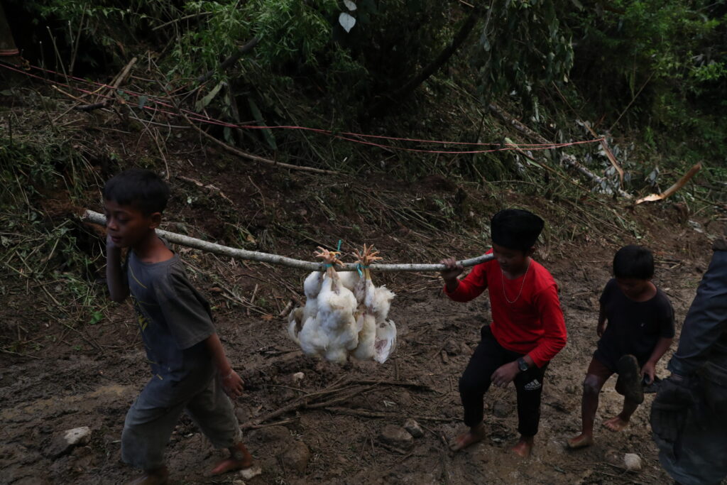 プルプルトレイルで悪戦苦闘する我々の横を、子供達が鶏を運んで行った。一体誰が頼んだのだろう?