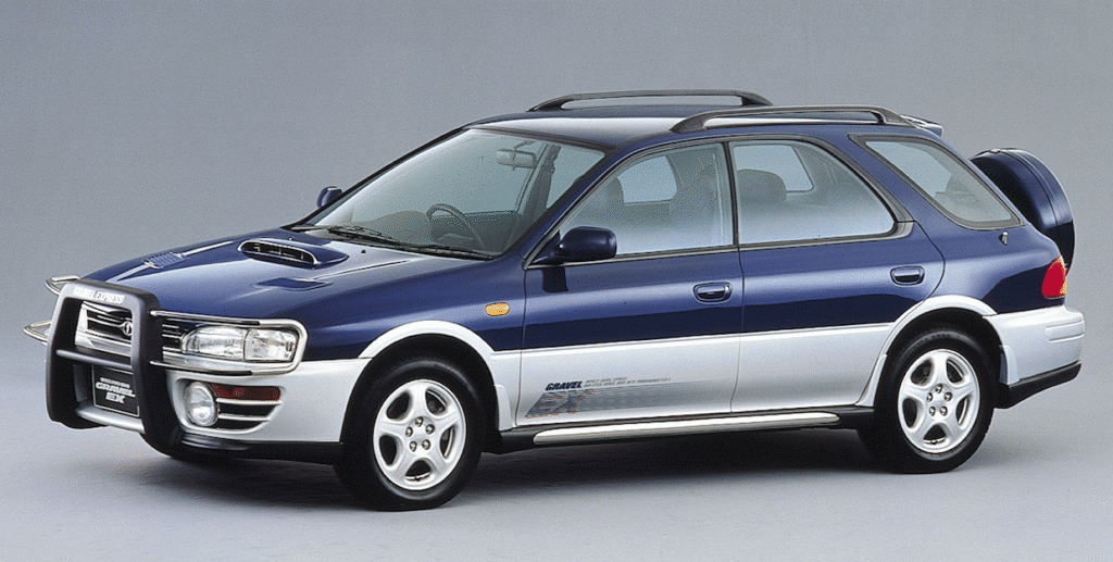 1995年発売のインプレッサスポーツワゴン・グラベルEX。インプレッサの地上高を上げて背面タイヤなどを装着したSUV仕様として好評を博し、フォレスターの前身的なモデルとなった。