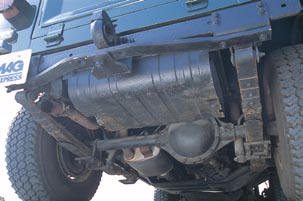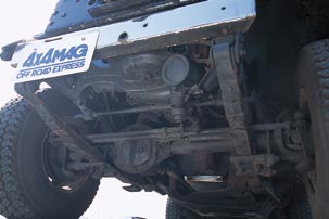 オフロードをカンガン走ってもへこたれないリーフ・リジッドの前脚。飛び出したステアリングギアボック