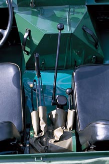 右から前進/後退切り替えレバー、ミッションのシフトレバー、パーキングブレーキ、2駆/4駆切り替えレバー、ハイ/ロー切り替えレバー。
