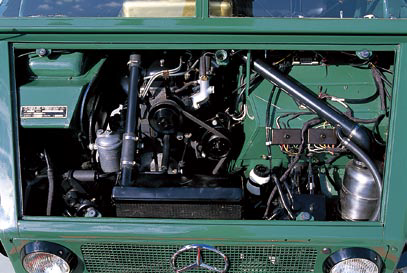 U411型に搭載されるエンジンは1.8リッター直4副室式ディーゼル。スペック上では最高出力34PS、最大トルク10.0 と、かなり非力に見えるが、それぞれの発生回転は極めて低く、ミッションの減速比も低く設定されているので、ウニモグとしては実用上なんら問題ない。