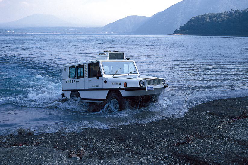 正真正銘の水陸両用車で、国内でも販売されたモデル。水中ではスクリュー推進に切り替え、思いのほか快適なクルージングができた。