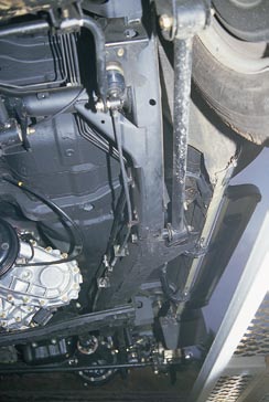 頑丈なボックス構造のフレームがボディーの前後を貫く。フレームに沿って延びるワイヤーは、スタビ解除装置のもの。