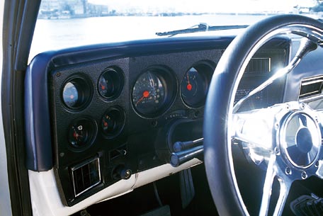 ビレット・ステアリングと、パワーウインドゥの装着以外は、ほぼオリジナルを再現しているインパネまわり。