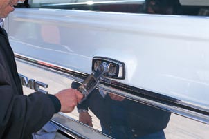 リアゲートのオーナメントを開くと展開されるクランクは、リアウインドゥの開閉ハンドル。ウインドゥを降ろしてから、ゲートを開く。