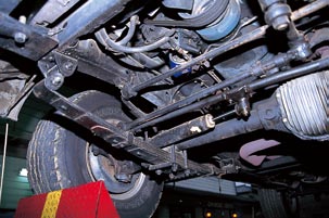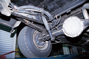 フロントのリーフスプリングはアンダースラング式。取材車は車高アップのためハイキャンバーリーフに交換されていた。