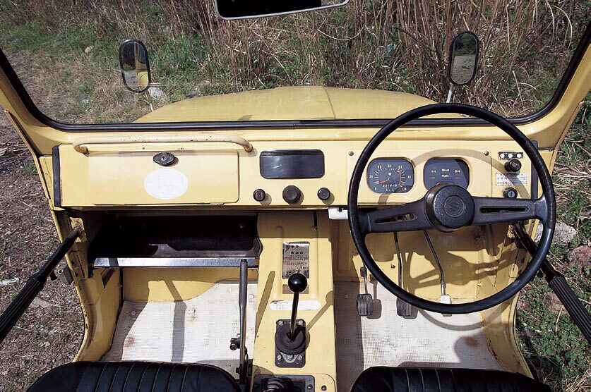 取材車両は’71年式の2型。空冷2ストローク・360ccのエンジンや、2速3軸式トランスファーを備えたパートタイム4×4、前後リーフ・リジッドのサスペンション、ソフトトップを備えたフルオープン可能なボディーなど、基本的な部分は1型と変わらないものの、細かい変更点は多い。エンジンの最高出力は25PSから27PSへアップ。最大トルクも3.4kg-mから3.7kg-mに向上している。キャリイの流用だったトランスミッションは、トランスファーを含めてギア比が見直され、その結果カタログの登坂力は27.5度から33度へと大幅に向上した。その他、幌のドアがファスナ―式のドアカーテンからフレームを持った幌ドアに変わったり、グローブボックスやパーキングブレーキにキーロック機構が付いたり、タイヤが6PRからジムニー専用と言える4PRに変更されたり、燃焼式ヒーターがオプション設定されたり…と、一般ユーザーの使い勝手は飛躍的に向上した。