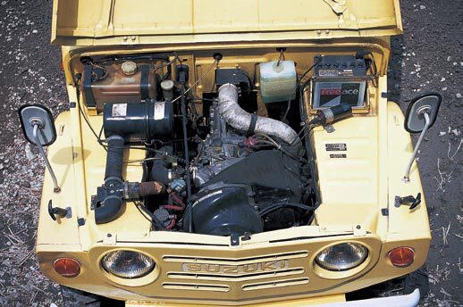 幌ドアを開けて運転席に乗り込み、2点式のシートベルトを締める。ダッシュボード右端のイグニッションにキーを差し込み、チョークを引いてスターターを回すと、ポロロンポロロン…と、例の2ストジムニーの軽いサウンドが響いた。